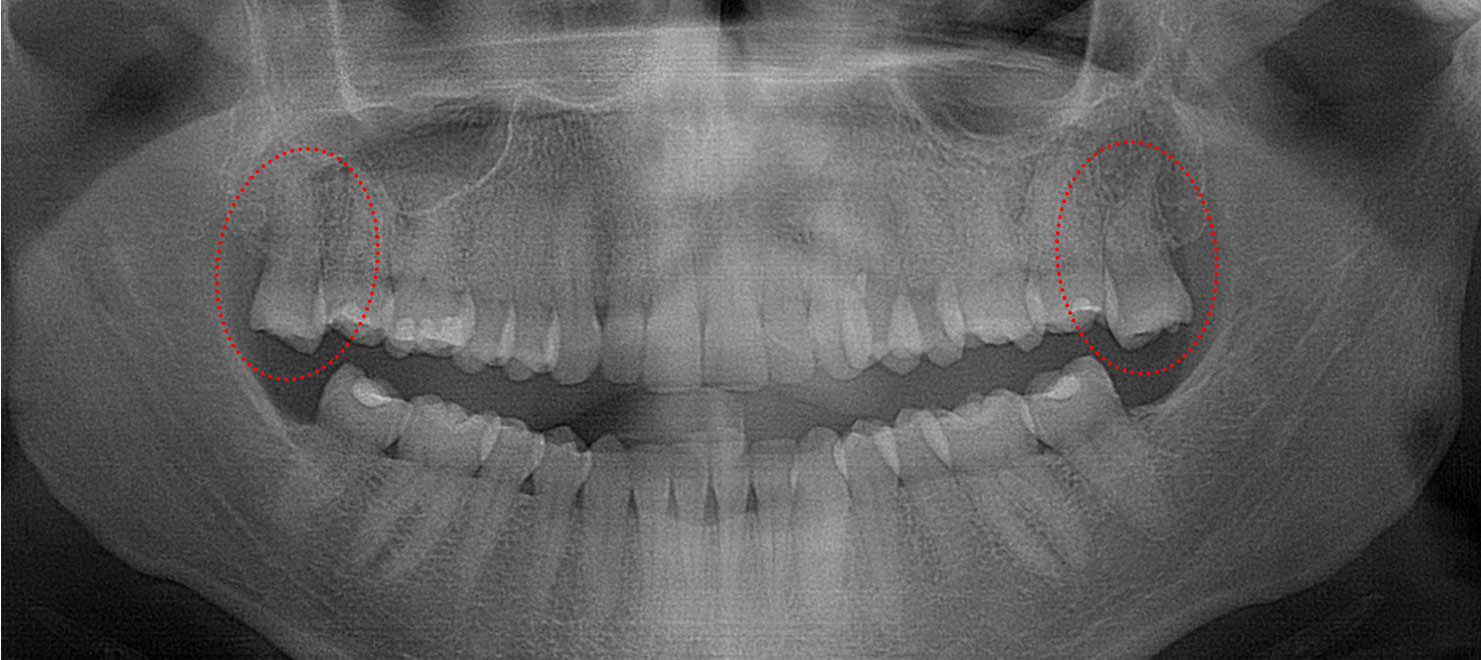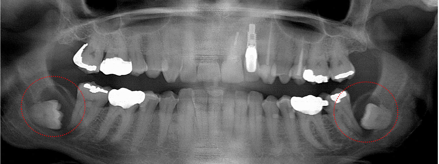 This 19 year old patient has all four 3rd molars present (circled). The roots are +90% formed. Both lower 3rd molars are impacted against the 2nd molars with no chance of further eruption and a +60% probability of decaying before age 30. The patient presented with pain and infection around both lower 3rd molars, requiring immediate extraction