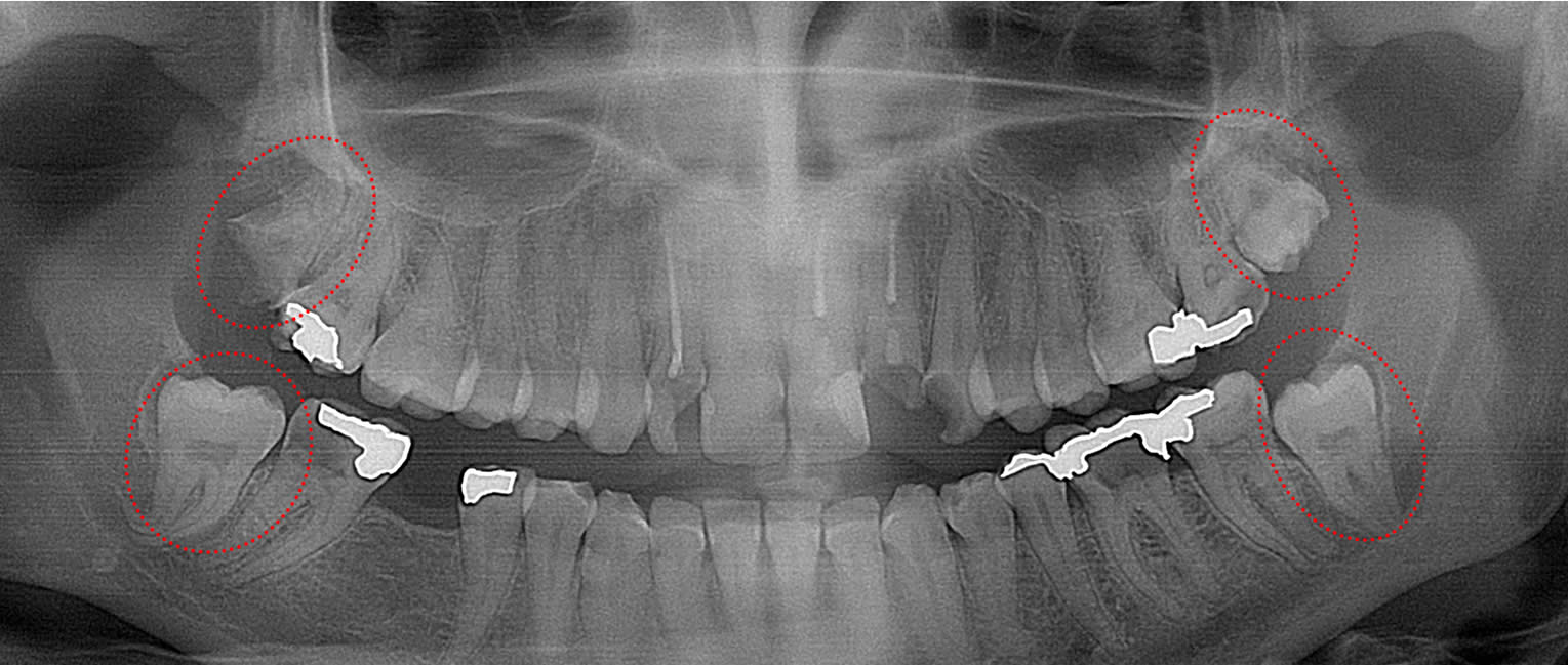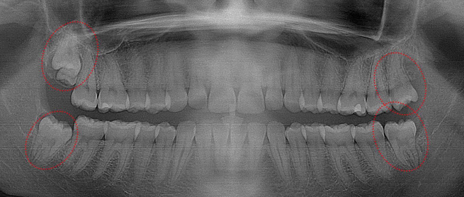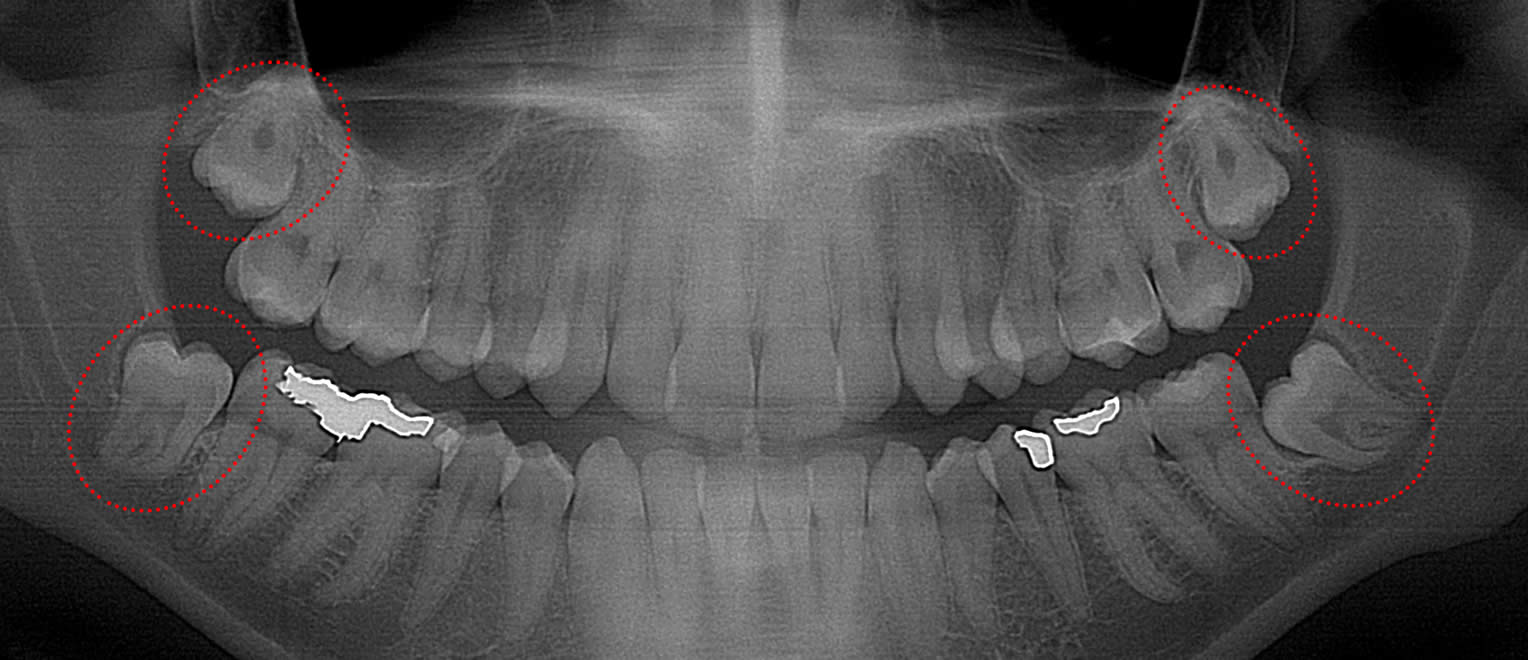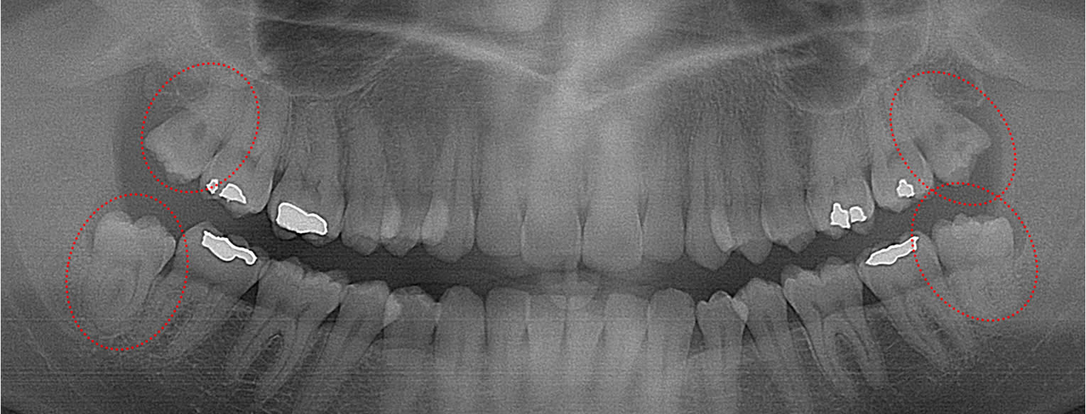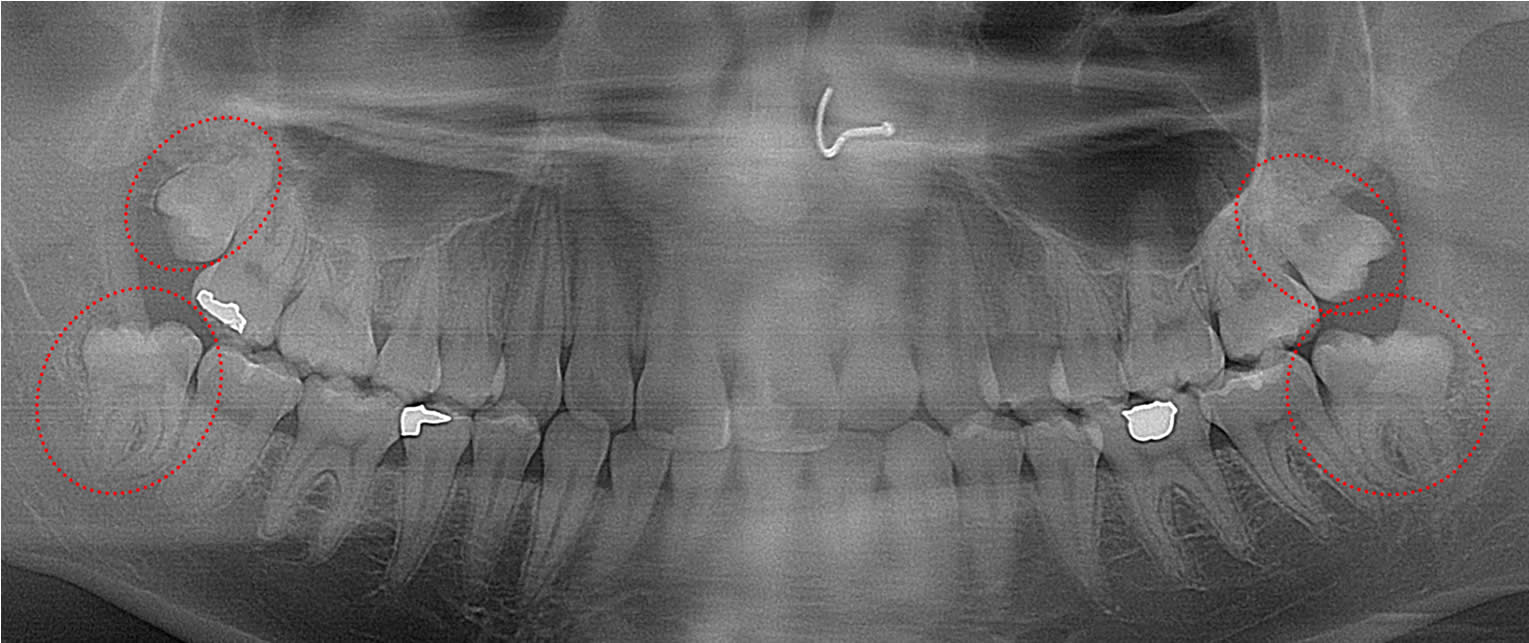 This 19 year old patient has all four 3rd molars present (circled). Only the upper left 3rd molar has fully erupted. The lower left 3rd molar is partially exposed and decaying while the lower right soft tissue impacted, both requiring extraction. Note the double crown on the upper right third molar.