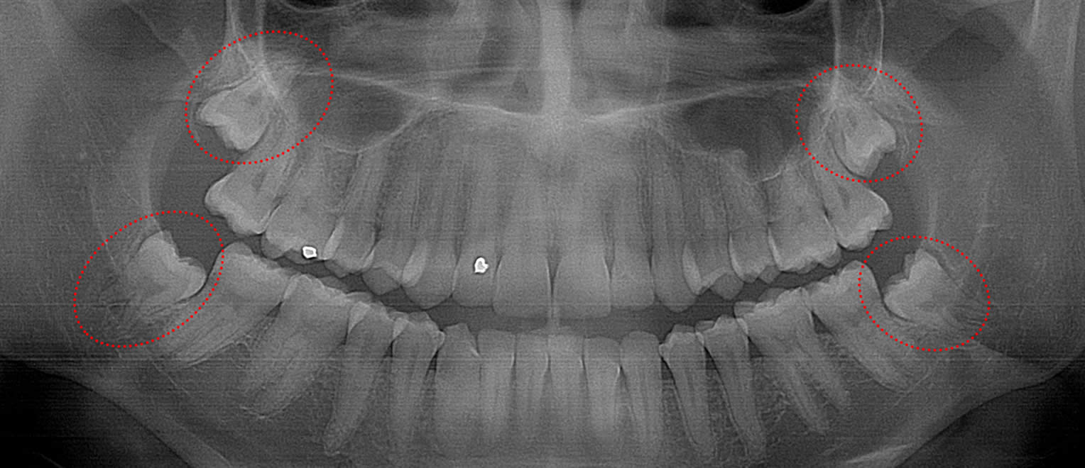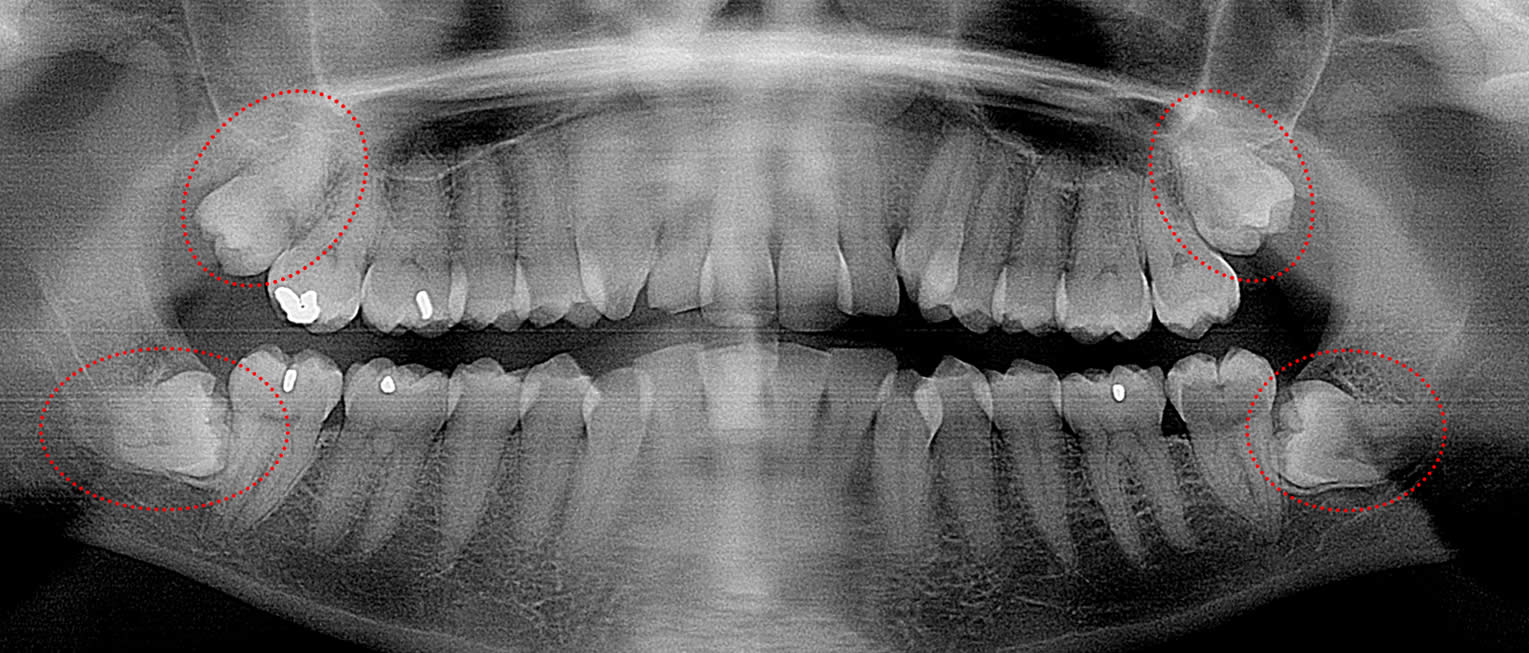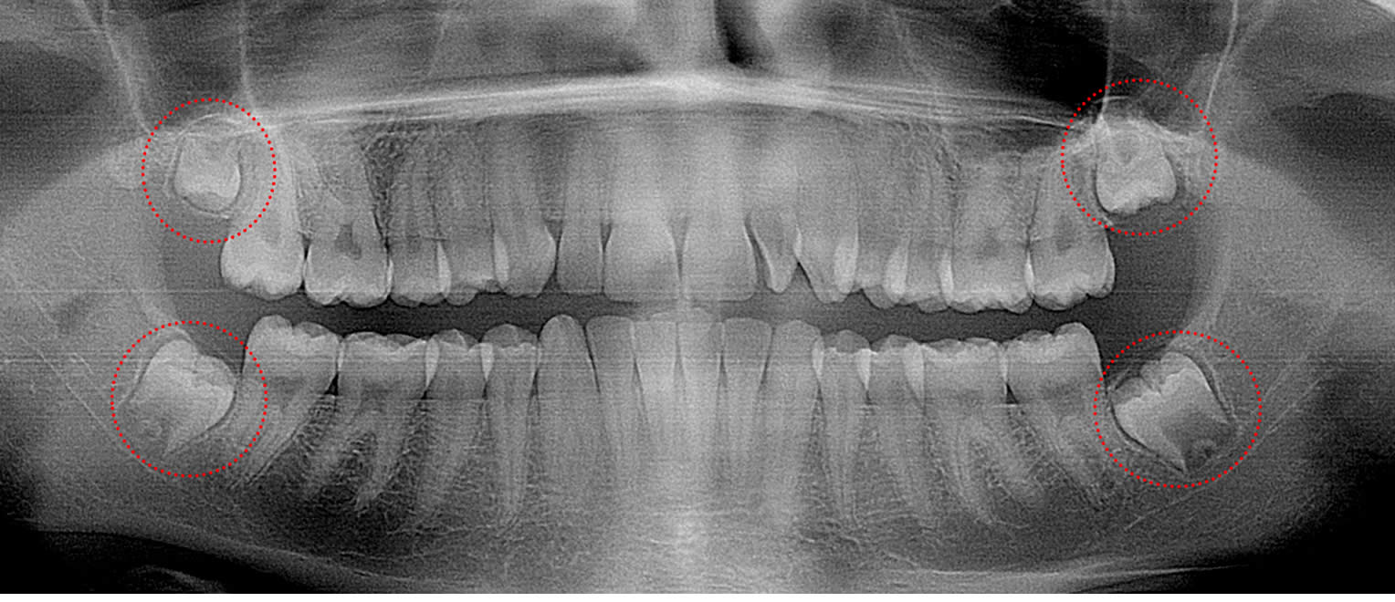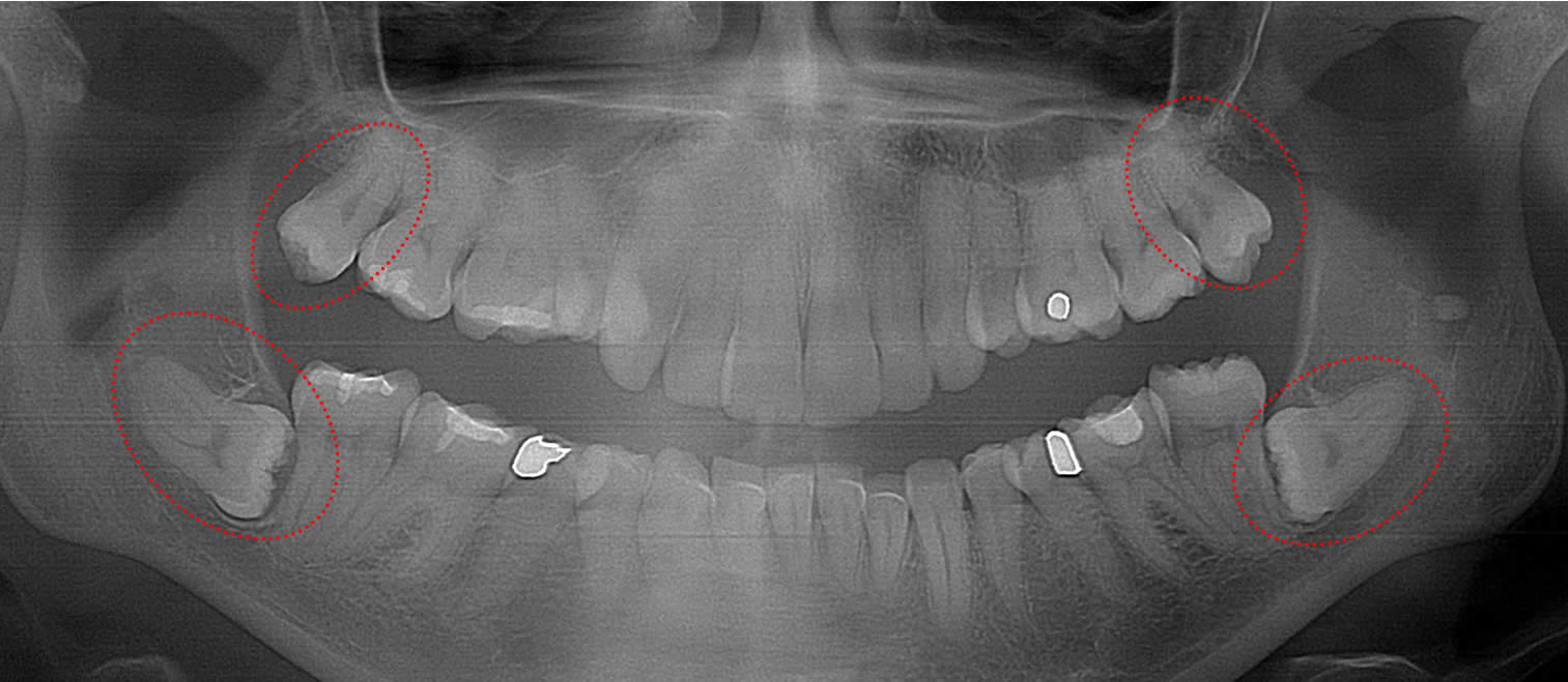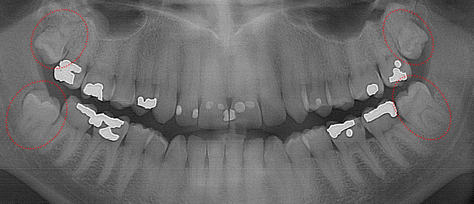 This 19 year old patient has all four 3rd molars present (circled). Only the upper left 3rd molar has fully erupted. The lower left 3rd molar is partially exposed and decaying while the lower right soft tissue impacted, both requiring extraction. Note the double crown on the upper right third molar.