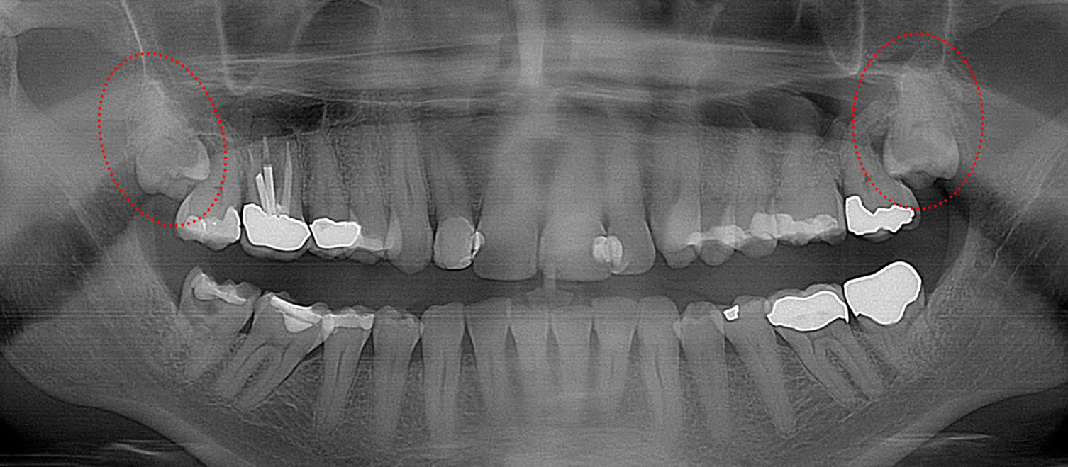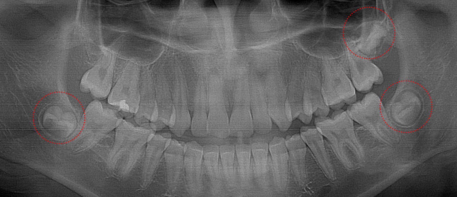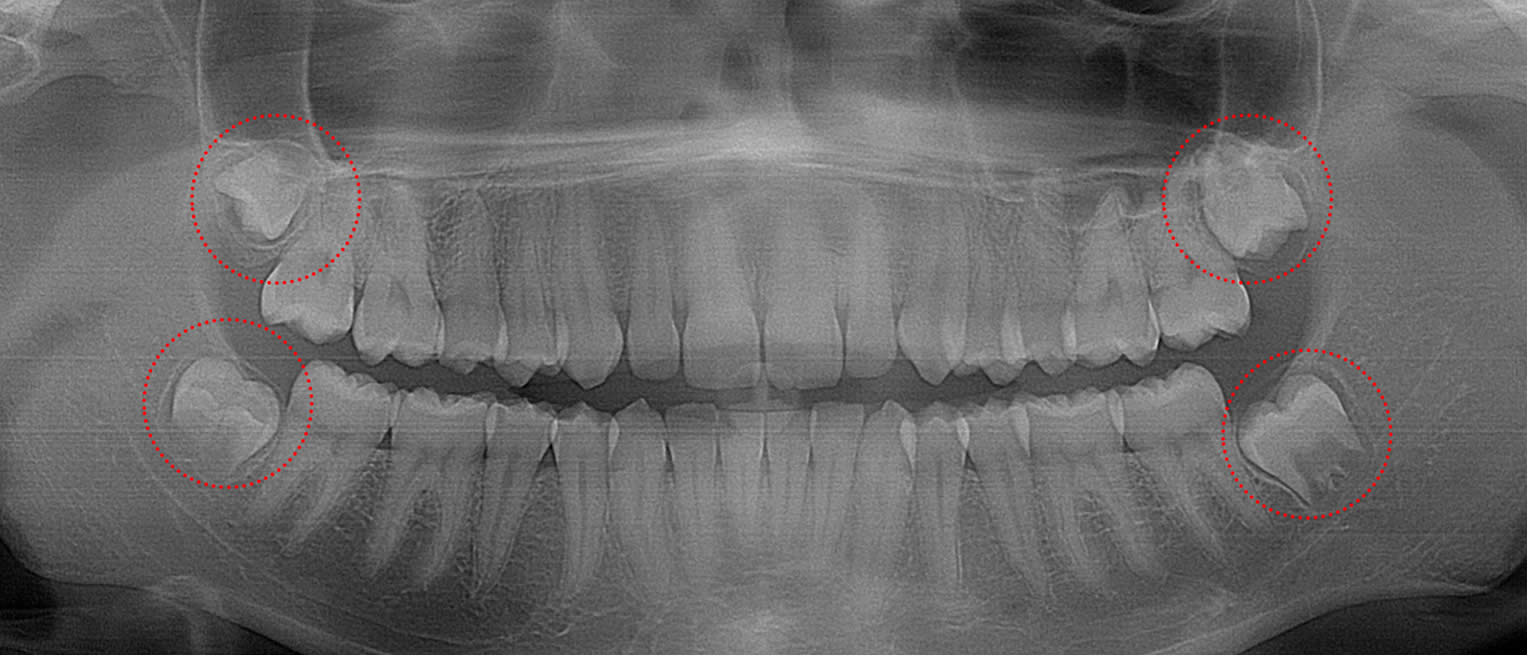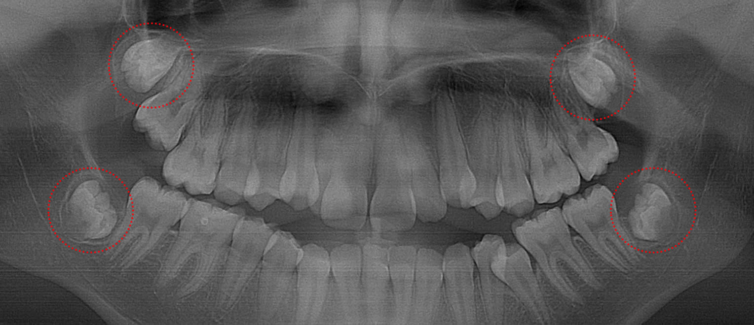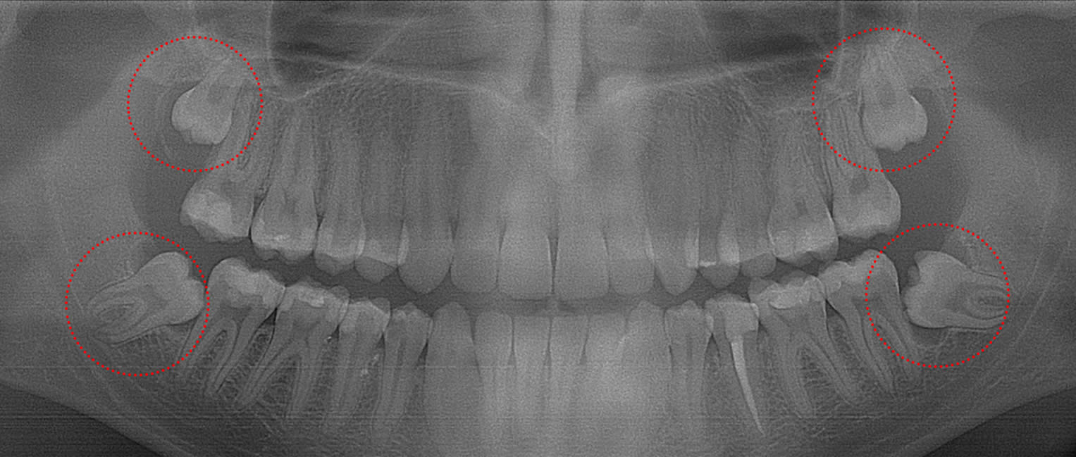 This 19 year old patient has all four 3rd molars present (circled). Only the upper left 3rd molar has fully erupted. The lower left 3rd molar is partially exposed and decaying while the lower right soft tissue impacted, both requiring extraction. Note the double crown on the upper right third molar.