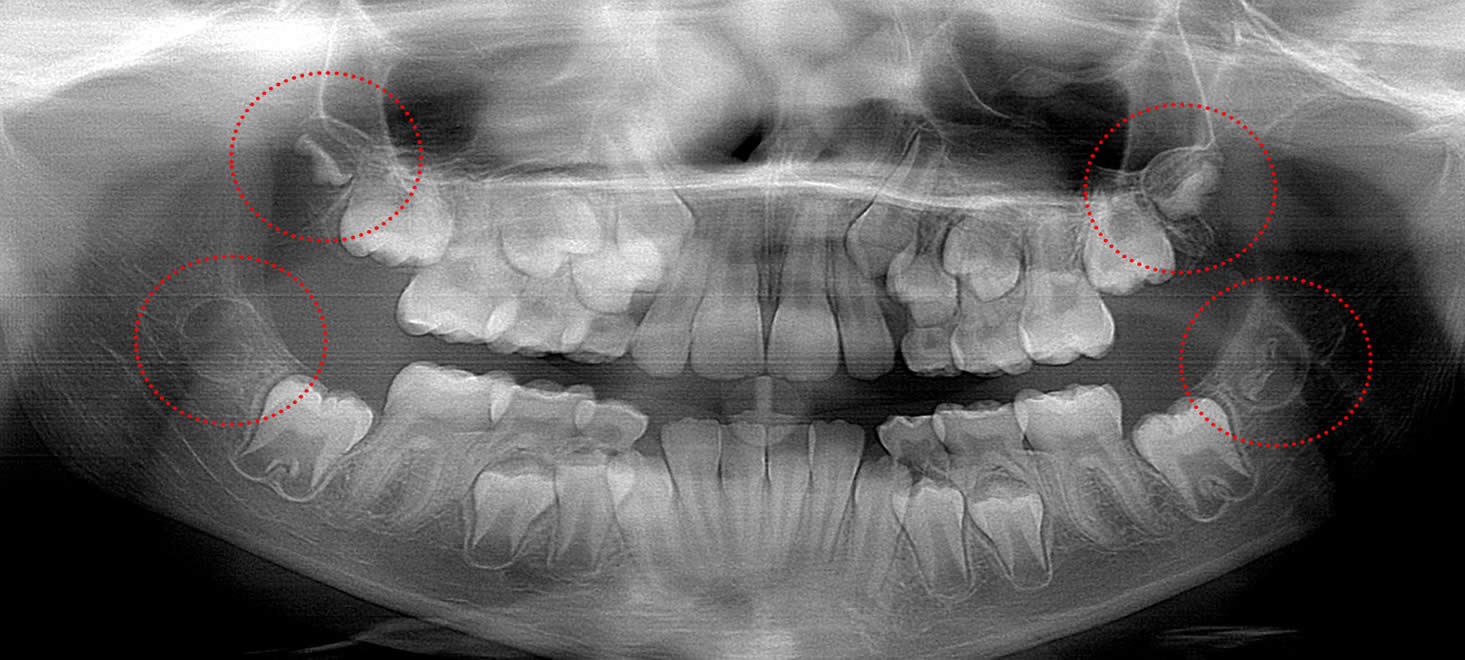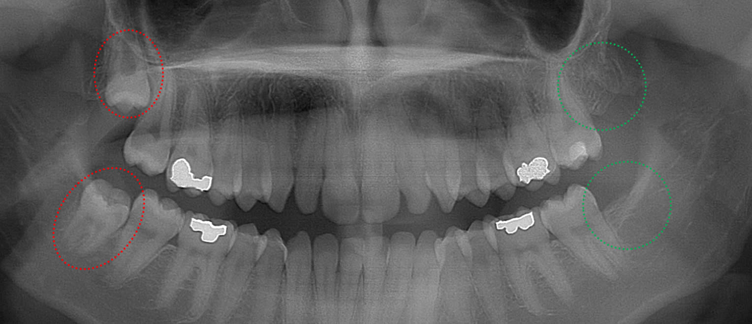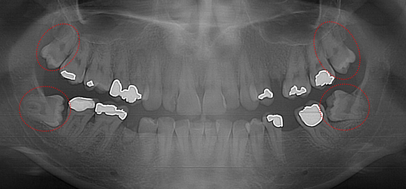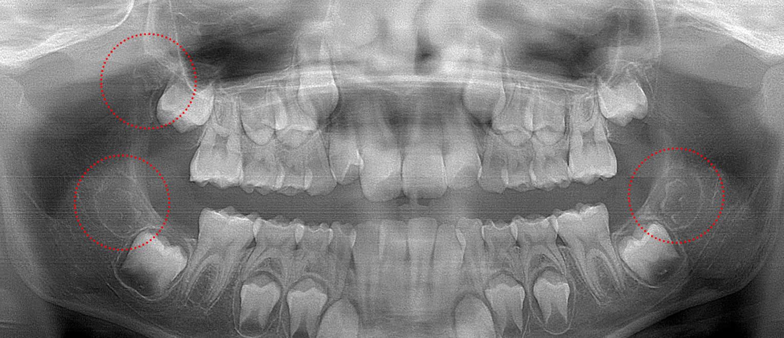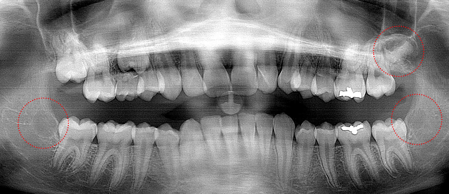 This 19 year old patient has all four 3rd molars present (circled). Only the upper left 3rd molar has fully erupted. The lower left 3rd molar is partially exposed and decaying while the lower right soft tissue impacted, both requiring extraction. Note the double crown on the upper right third molar.