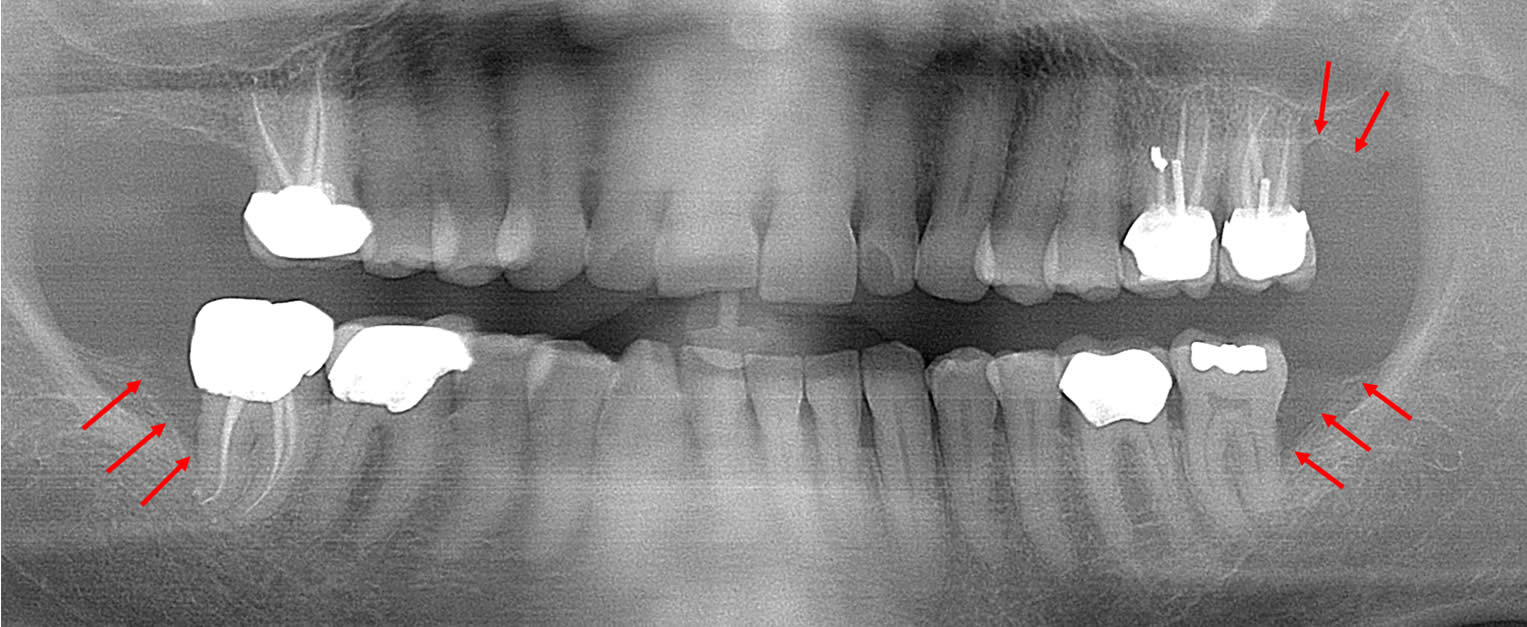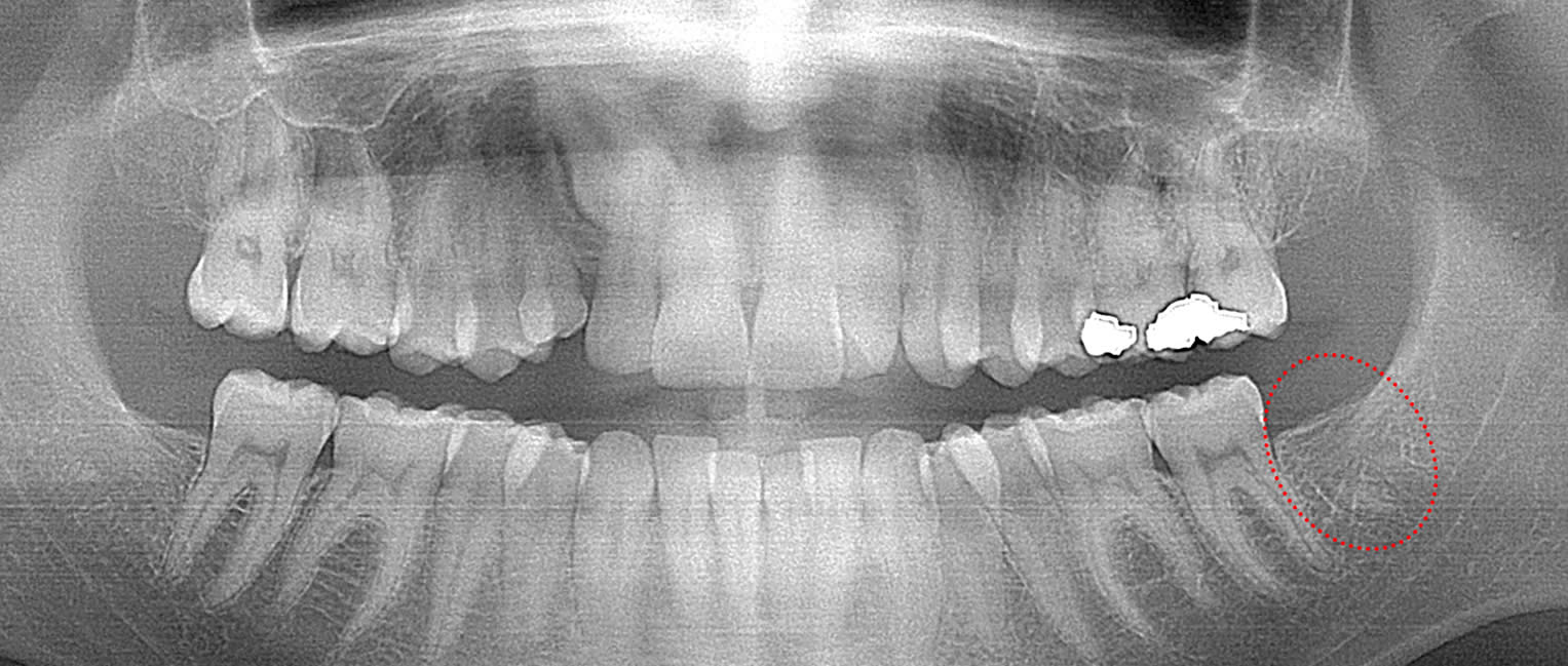 This 52 year old patient had the lower right 3rd molar extracted 6 years earlier due to a chronic infection. The boney defect (arrows) posterior to the 2nd molar (circled) is a site with a chronic gum infection present. Repeated cleaning is necessary to prevent further bone loss around the 2nd molar. Note the other two 3rd molars laying in the bone.